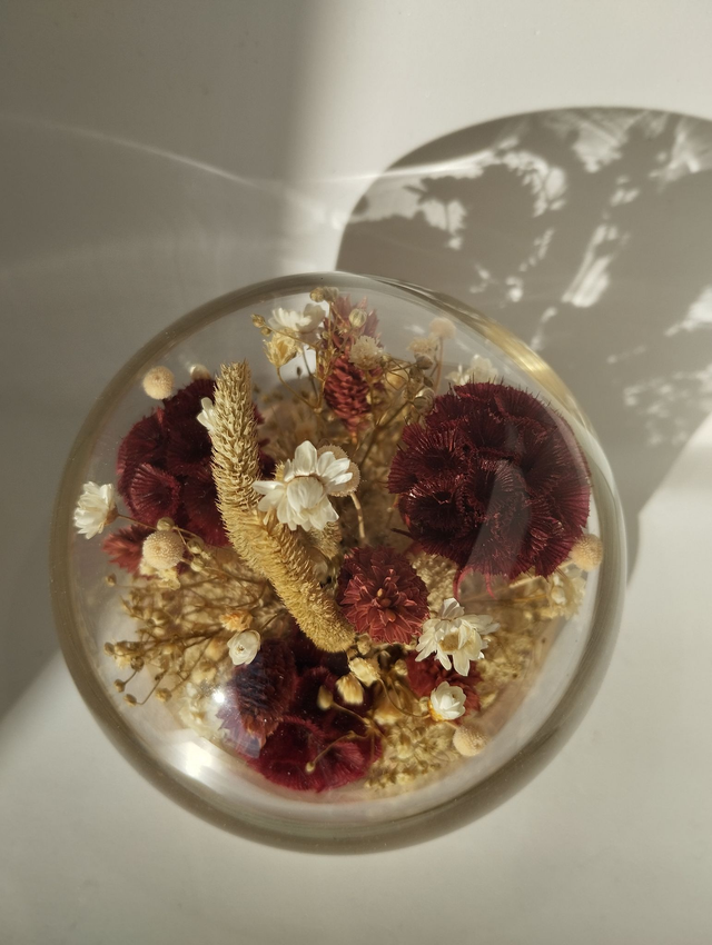 Cloche en verre posé sur un socle en bois, agrémenter de fleurs séchées et stabilisées.